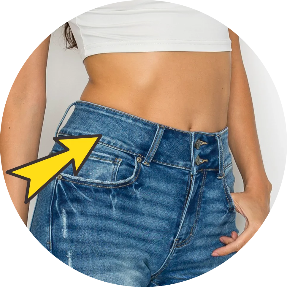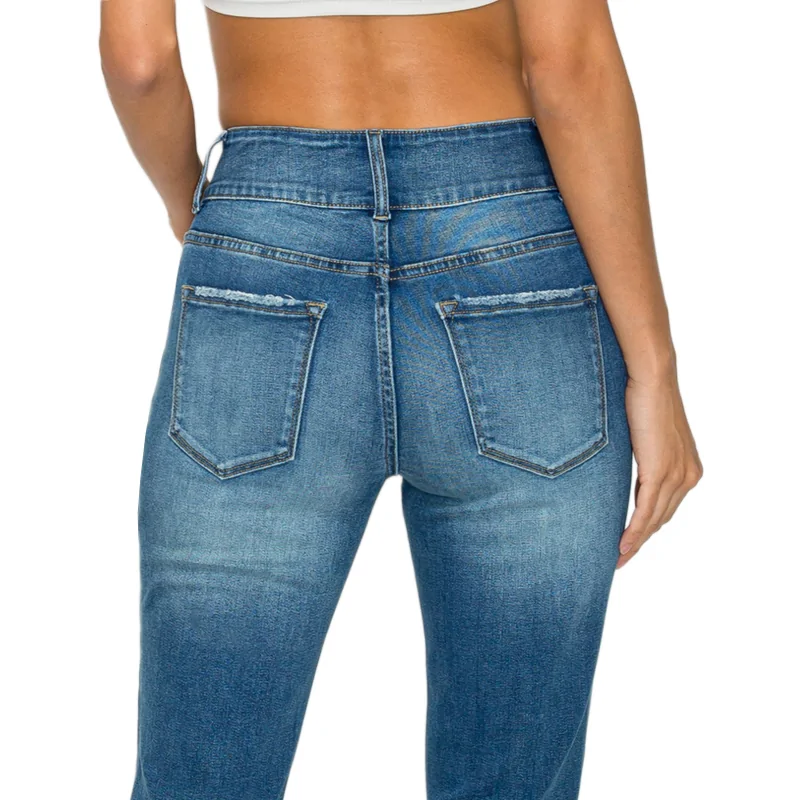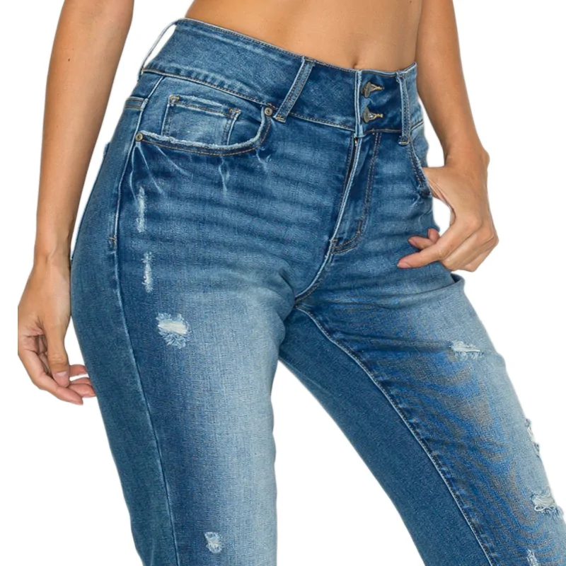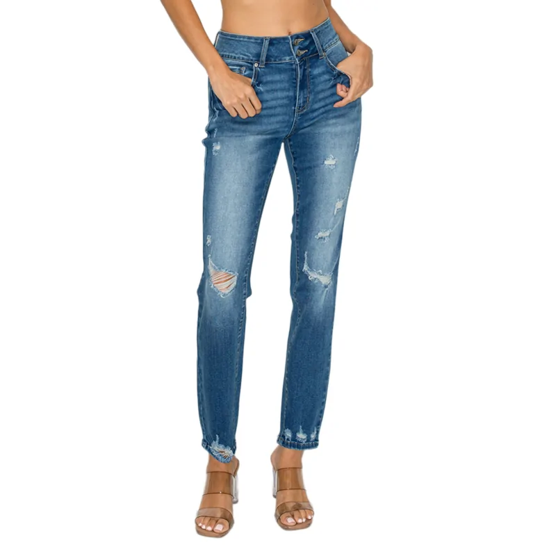 • Dual-Button Wide Waistband: Extra-wide design (3.5"/9cm) for superior comfort and tummy control. • Material Composition: 68%Cotton. 27%polyester. 3%viscose. 2%spandex• Strategic Ripped Details:Fashion-forward knee and ankle distressing details• 5-Pocket Styling: Includes 2 hand pockets, 1 coin pocket, and 2 back pockets.